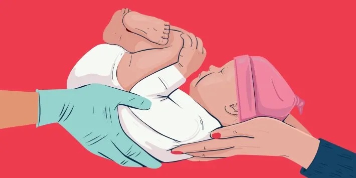 一名新生儿从代孕母亲手中交到意向父母手中。